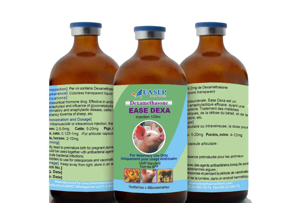 Indications:Adrenocortical hormone drug.Effective in antiinflammation,antianaphylaxi and exert an influence on glycometabolism.Treatment of inflammatory and anaphylactic disease, cattle ketosis, and pregnancy toxemia of sheep,etc conditions.Secondary anaemia due to parasitic and bacterial infections,stress conditions(also due to transportation),for the betterment of breeding and growth of young animals,as supporting treatment of infectious diseases and in blood loss